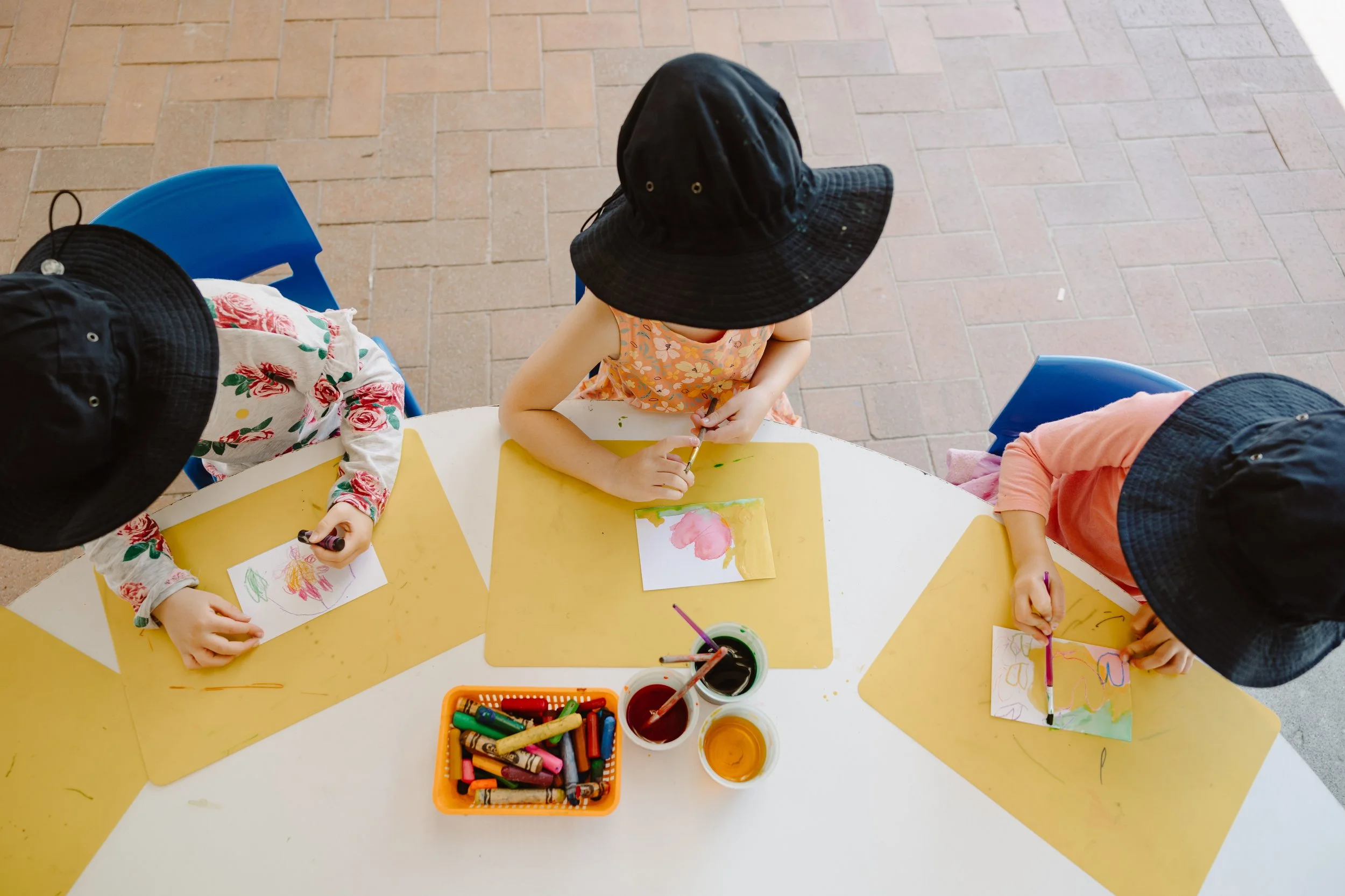Children wearing wide-brimmed hats playing outside at a playground, with trees and a canopy in the background.
